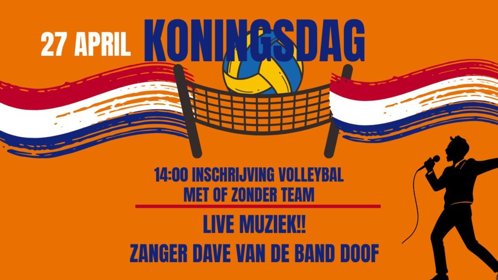 Ook dit jaar gaan we weer volleyballen in de gymzaal tijdens Koningsdag. Gevolg door een optreden van Zanger Dave van de band Doof in Meelmuis!
